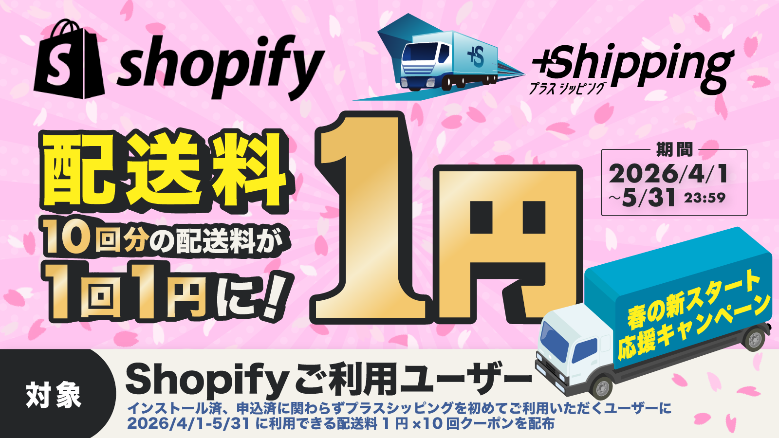プラスシッピングでは、プラスシッピングを初めてご利用いただくShopifyストア様を対象に、「春の新スタート応援!配送料1円キャンペーン」を期間限定で実施いたします。